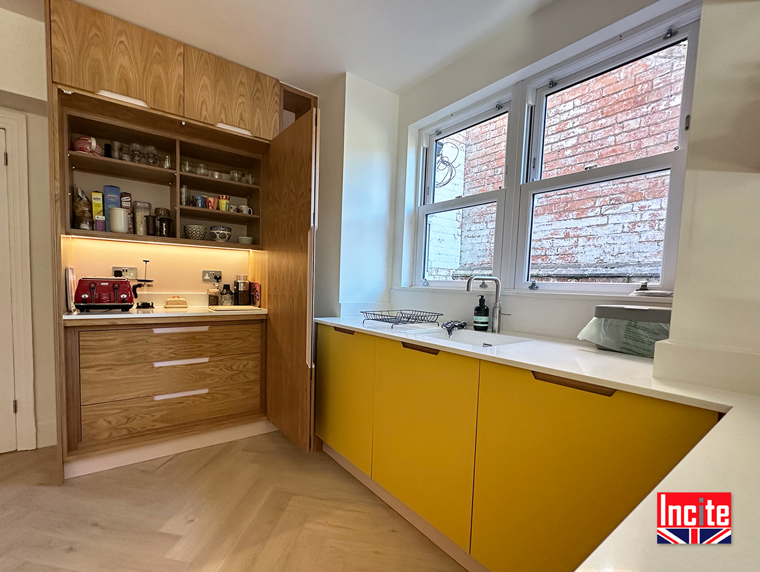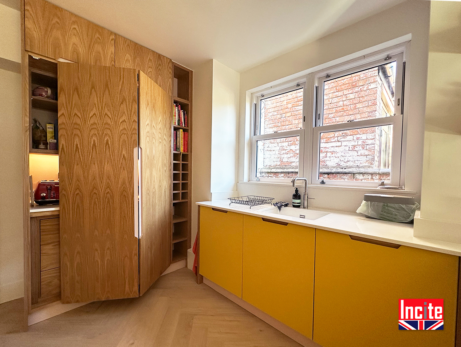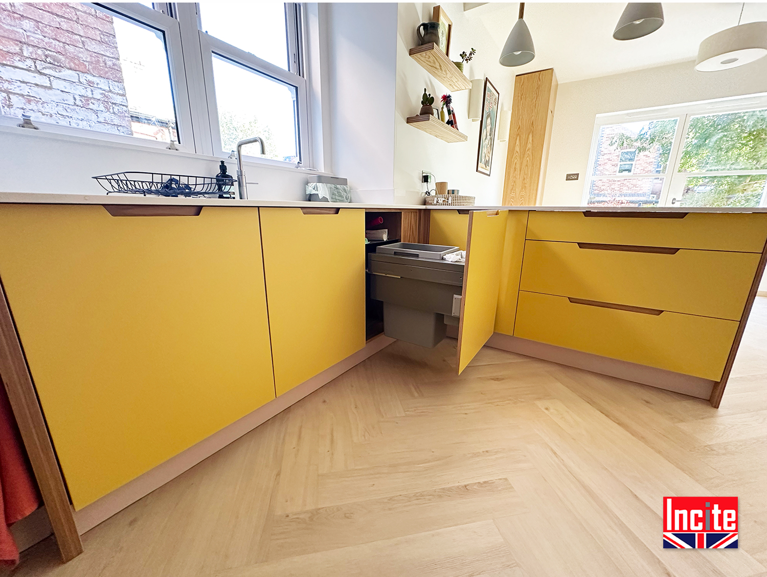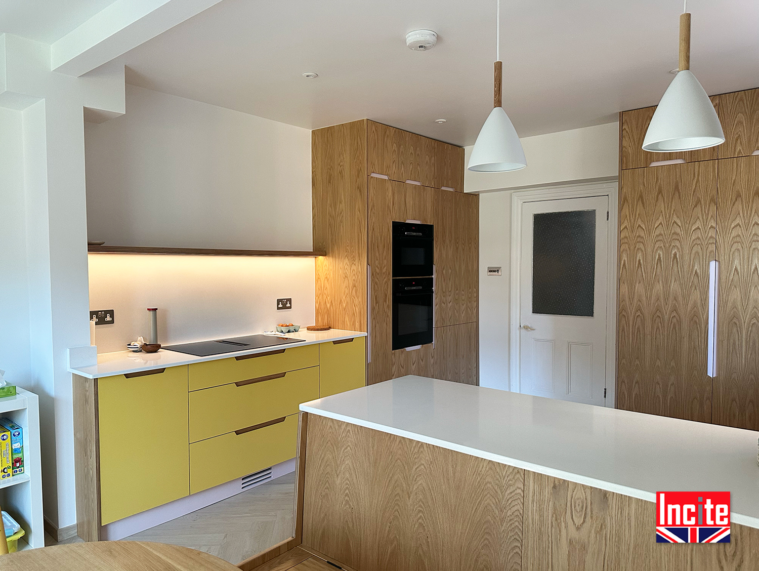 Contemporary Painted Yellow Oak Kitchen custom made by Incite Interiors Derbyshire