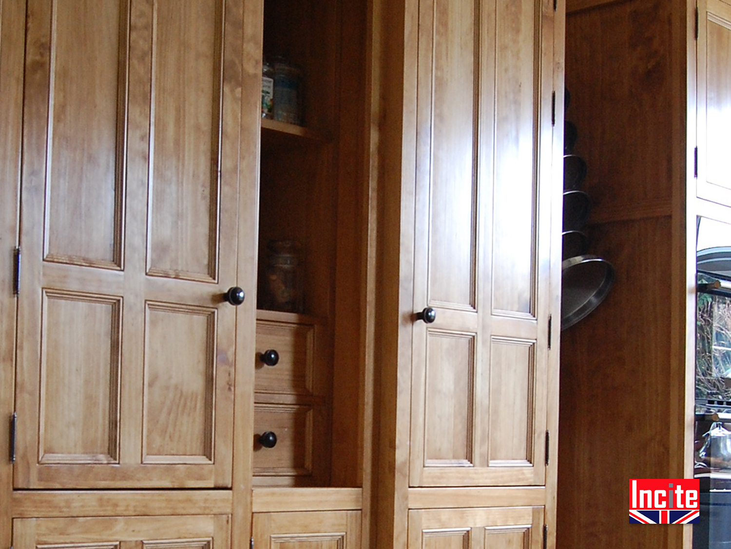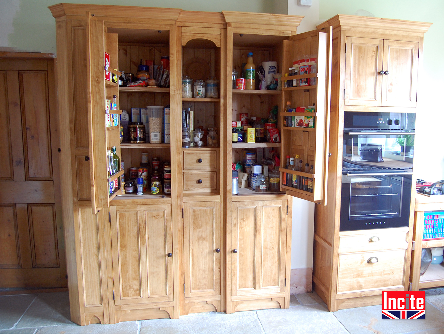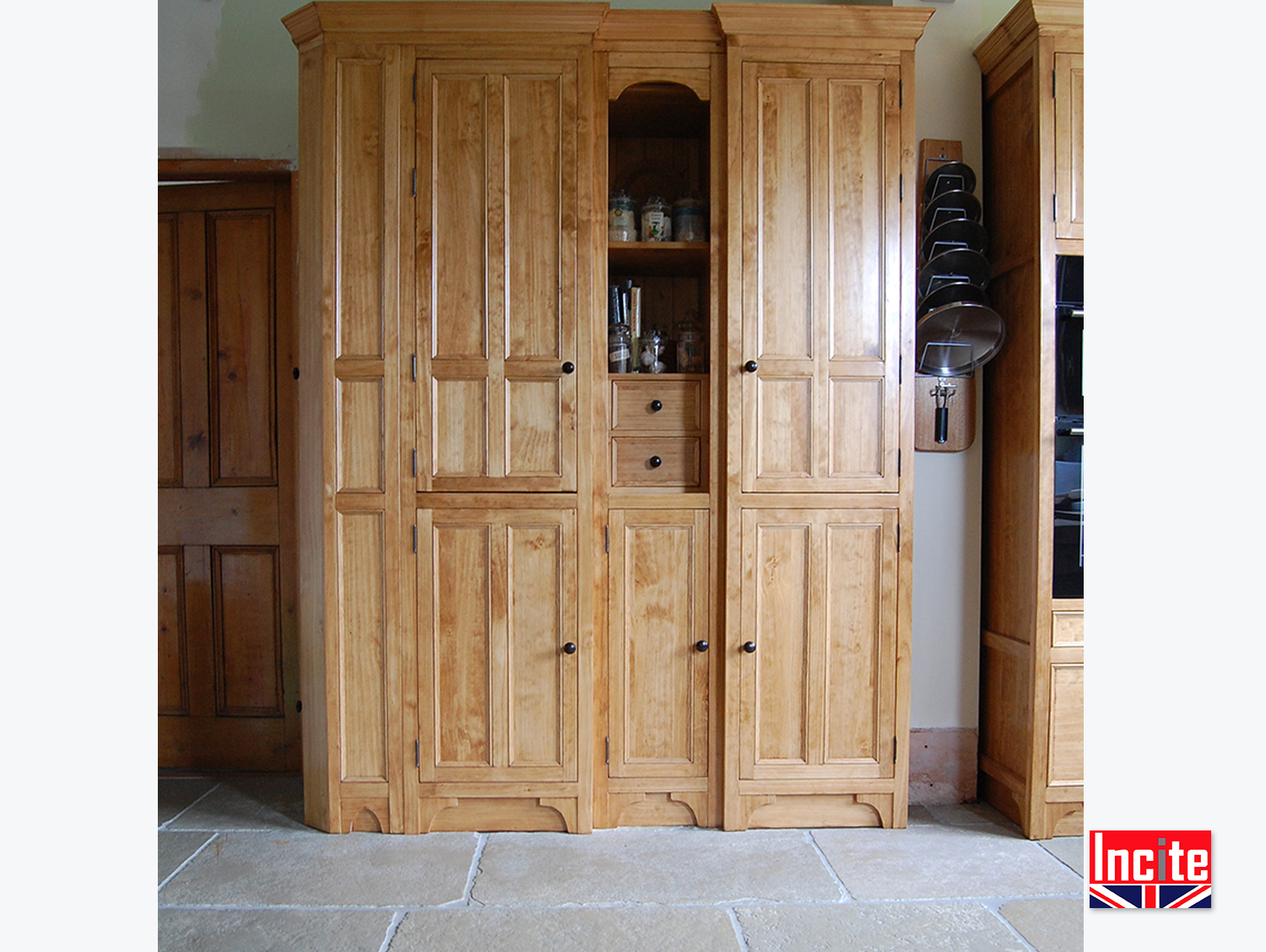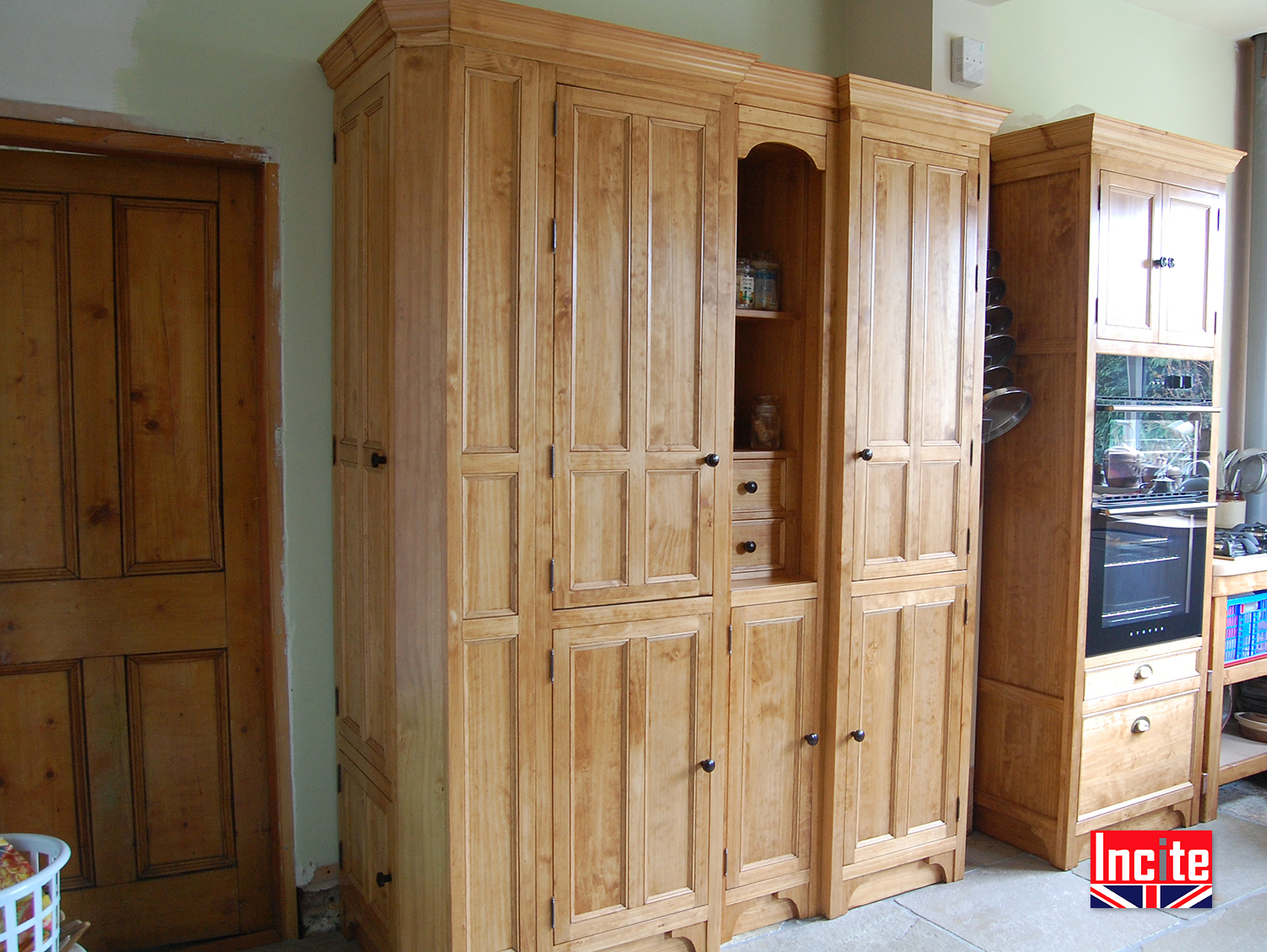 This unique quirky solid bespoke handmade freestanding wooden scullery kitchen comprising of a free standing sink unit, stand alone oven housing and larder unit looks amazing in this customers Edwardian home. This unique custom handmade original kitchen was designed, produced and fitted entirely by Incite Interiors at our listed Derbyshire Mill workshop.